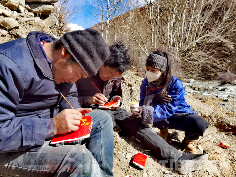 圖為卡熱鄉6個村(居)第一書記及邊據村駐村工作隊正在石頭上手繪國旗