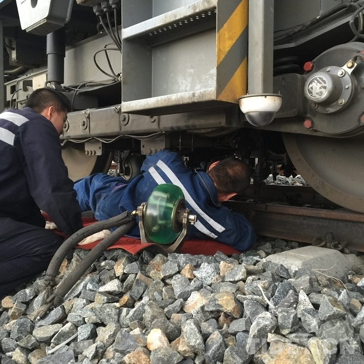 即將達(dá)到加查站時(shí),探傷員余賢明發(fā)現(xiàn)探傷車左側(cè)第2個(gè)探輪有破損現(xiàn)象,需要更換探輪,大家立刻按照分工各就各位。隊(duì)長(zhǎng)聯(lián)系集團(tuán)公司調(diào)度、加查站安排探傷車停靠車站,設(shè)置好防護(hù)后,李生紅和余賢明立即鉆到車下拆卸破損探輪,崔成剛和李慧臣則準(zhǔn)備好新的探輪。四個(gè)人分工協(xié)作,在夜幕降臨之前將新的探輪安裝了上去。