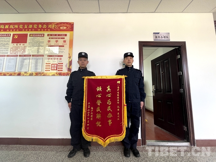 中國西藏網訊 “真心為民辦事,傾心替民解憂!”近日,西藏自治區林芝邊境管理支隊南伊邊境派出所收到一面來自廣東的錦旗,向派出所移民管理警察沈朋、吳川江的幫助表示感謝。