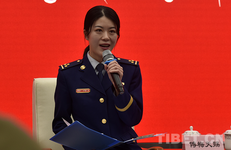 圖為拉薩市消防救援支隊(duì)布達(dá)拉宮消防救援站指導(dǎo)員傅梅天賜現(xiàn)場(chǎng)發(fā)言 攝影:王媛媛