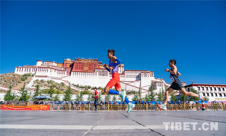 圖為拉薩半程馬拉松比賽中運(yùn)動健兒從布達(dá)拉宮前飛奔而過 攝影:趙耀