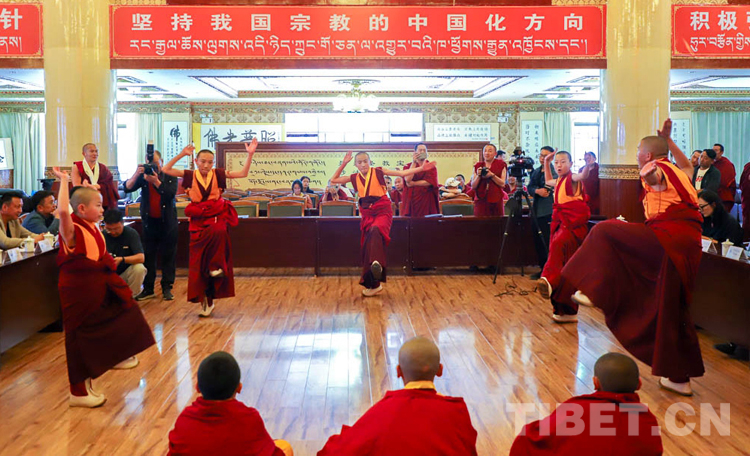 據了解,與傳統寺廟教育相比,西藏佛學院開設有文化課和佛學兩大體系,天資聰慧的少年活佛們在校期間已經開始研習含義深刻、博大精深的《五部大論》《入菩薩行論》等佛教經典作品,目前已經可以流暢地背誦部分經典。在當日的學習成果匯報展示會上,少年活佛們不僅展示了藏漢雙語朗誦、藏漢文書法、英語情景劇等,也為大家帶來了《入菩薩行論》第一章的背誦展示和辯經展示。