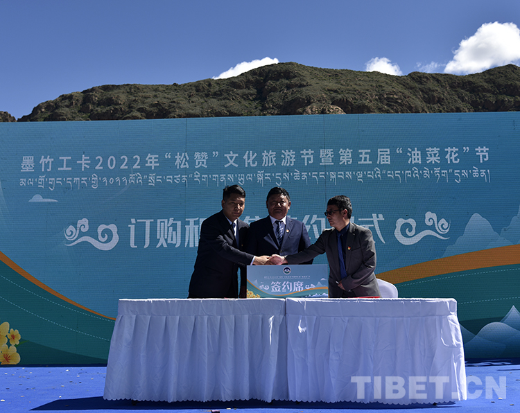 圖為墨竹工卡縣松贊文化旅游節暨第五屆油菜花節開幕式上,墨竹工卡縣農牧業凈土產業發展有限公司代表與唐加鄉、扎西崗鄉分別簽訂認購、預售合同 攝影:王媛媛