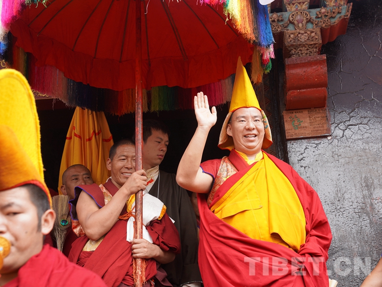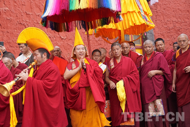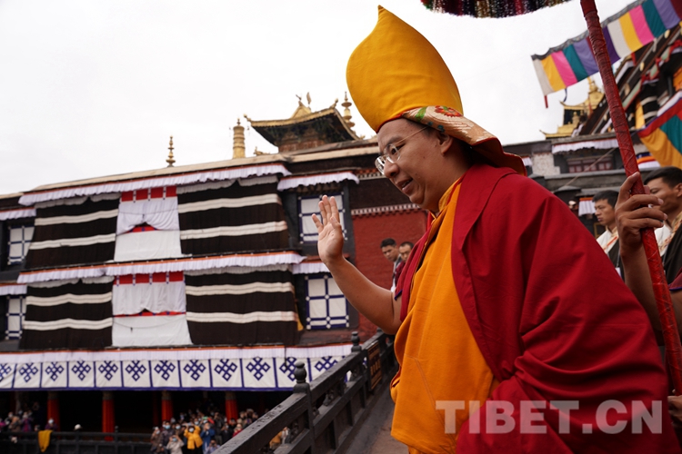 班禪抵達,現場桑煙繚繞,法號聲悠長,扎什倫布寺僧眾以藏傳佛教最高禮儀迎接班禪?,F場等候班禪的信教群眾紛紛摘帽行禮或雙手合十,向班禪的到來表示熱烈歡迎,班禪見狀揮手致意、送上祝福。隨后,班禪在手持黃傘、香爐的高僧引領下緩緩步行至措欽大殿。