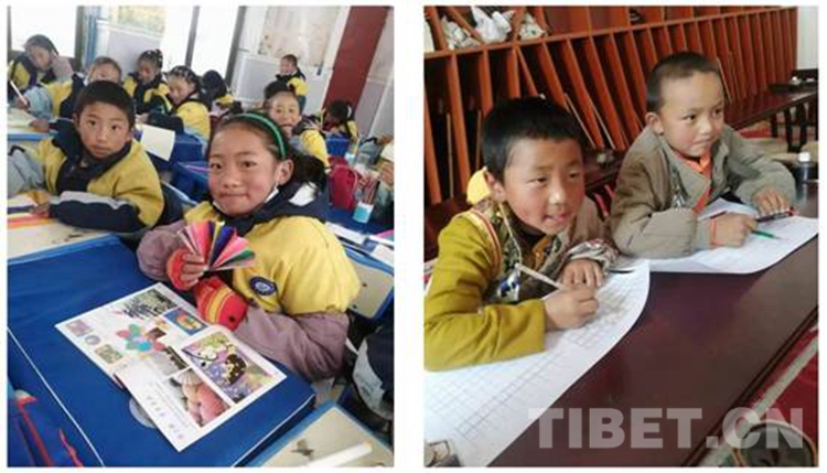 圖為西藏自治區那曲市比如縣羊秀鄉小學的孩子們在上手工課(左)和書法課(右) 攝影:米瑪旺久