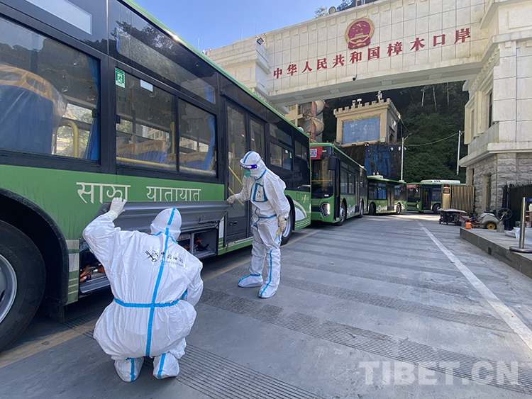 圖為拉薩海關(guān)所屬聶拉木海關(guān)關(guān)員監(jiān)管?chē)?guó)產(chǎn)新能源公交車(chē)出口