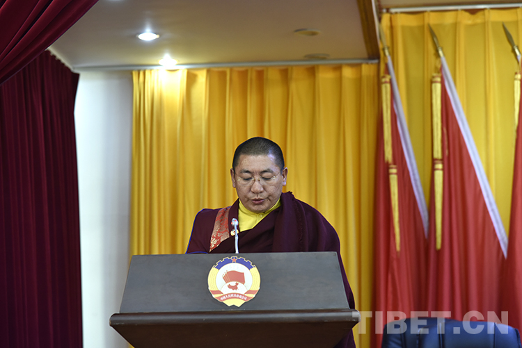 圖為12月12日,拉薩市政協十二屆三次會議第二次全體會議現場,宗教界委員曲仲·阿旺強久旦增加措發言 攝影:王媛媛