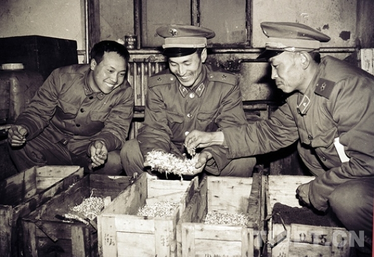 這是青藏公路五道梁兵站官兵在觀看自己新生產出的豆芽。在風雪青藏公路線上,它豐富了過往人員就餐的“菜盤子”(唐召明1987年攝)