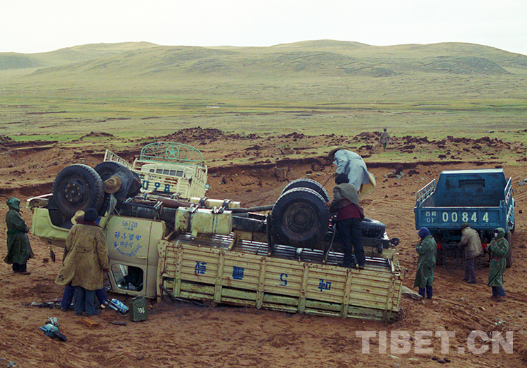 這是作者從西藏調到北京工作,所乘坐的“東風”牌卡車不幸在唐古拉山下翻車,得到了青藏公路安多養護段巴恰等道班工人的鼎力相助(唐召明1991年攝)