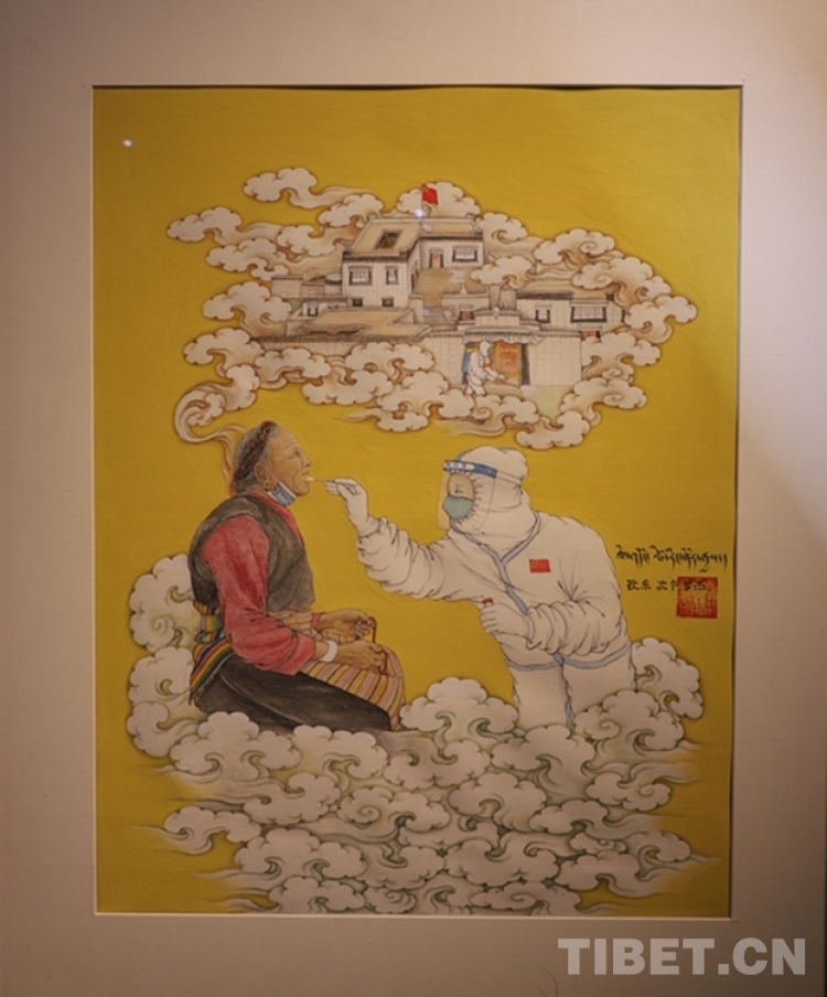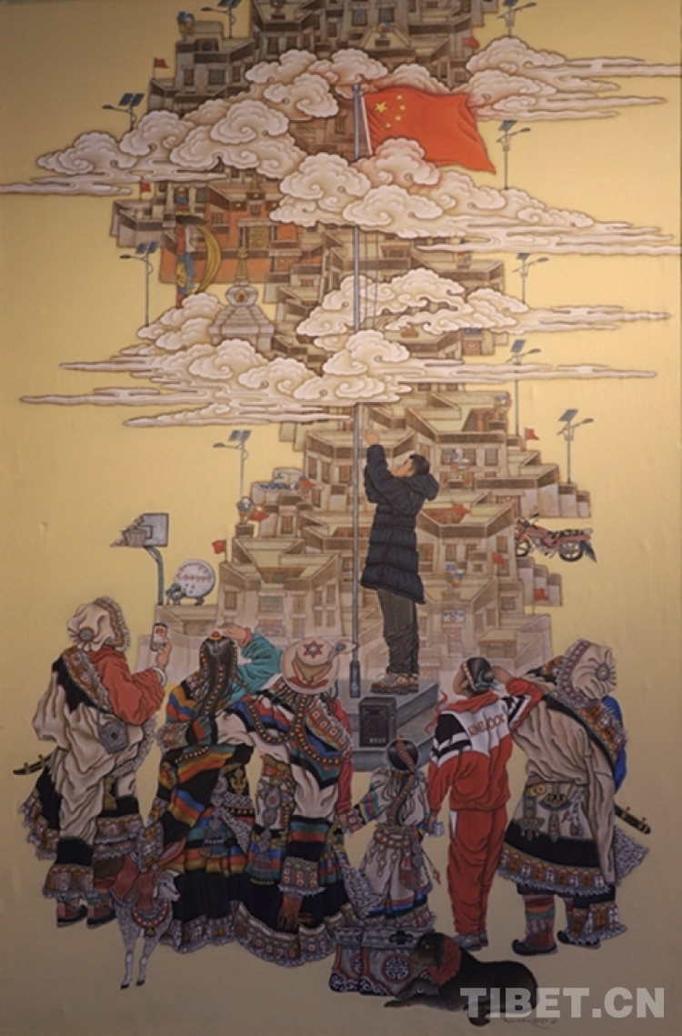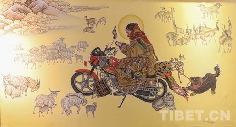 “畫家們在延續深厚傳統文化,彰顯西藏唐卡繪畫高超技藝的同時,不固守畫派風格特色,用創新的方式聚焦偉大時代,描繪美好生活,歌頌西藏與祖國同行的盛世圖景?!蔽鞑刈灾螀^文聯副主席尹小林說。
