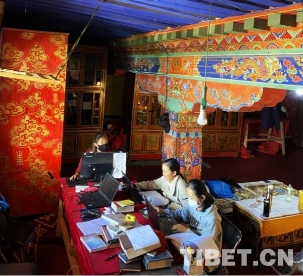 圖為2021年,西藏民族大學實習生對布達拉宮藏經進行記錄和統計