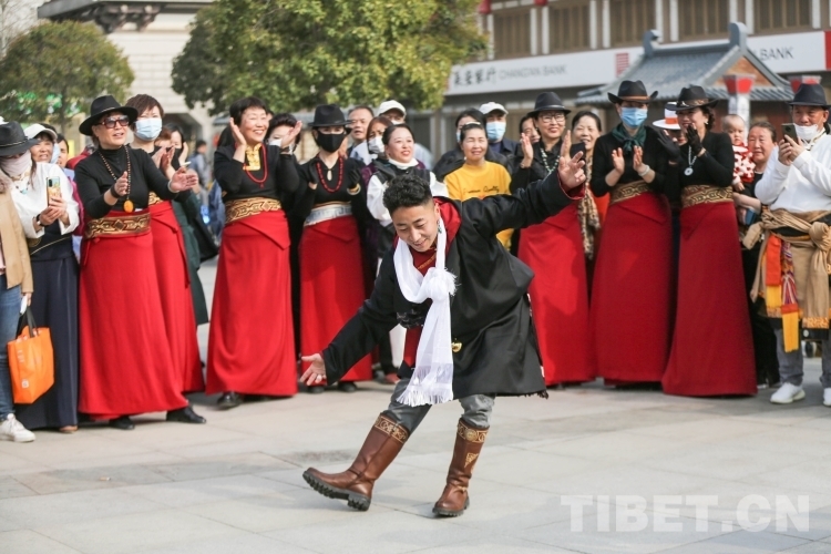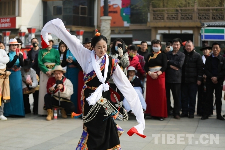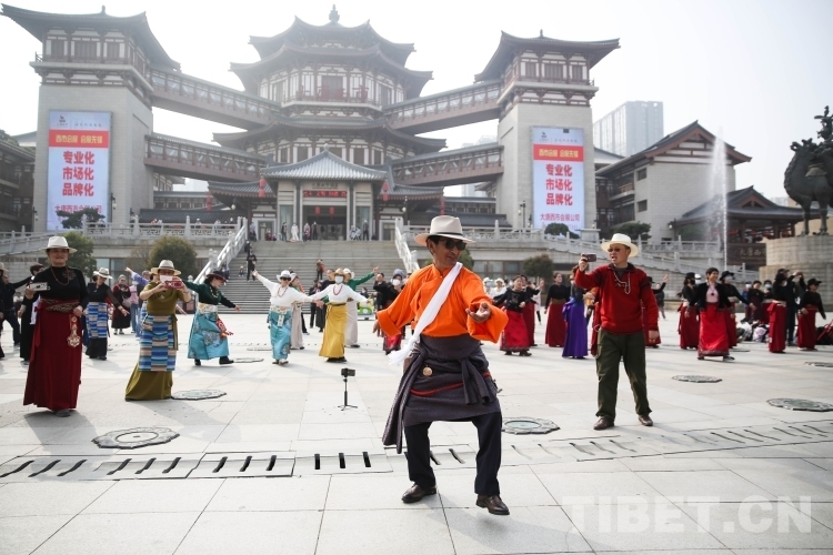 中國西藏網訊 3月21日,由新的社會階層人士服務團三分團主辦、北京藏地神韻非物質文化傳播發展公司承辦的傳統藏舞公益推廣活動在西安舉辦。多位藏舞傳承人與藏舞愛好者齊聚西安大唐西市進行公益推廣交流。鍋莊、伊舞,《歡迎你們到來》《舞動青春年華》《吉祥的哈達》……一曲接著一曲,舞出了藏族舞蹈的無限魅力!(中國西藏網 記者/呂靜 姚浩然)