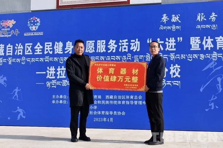 活動開幕式現場,西藏自治區體育局社體中心向拉薩市實驗小學東城分校,配發了價值四萬元整的校園體育器材,保障學生日常體育運動需要。