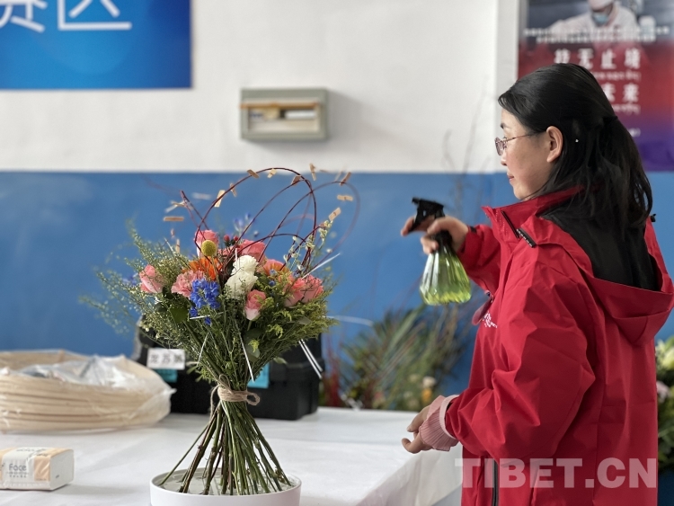 圖為林芝市職業技術學校職工組選手龍蘇娟對自己的花藝作品進行噴水保鮮 攝影:德吉卓瑪