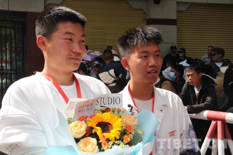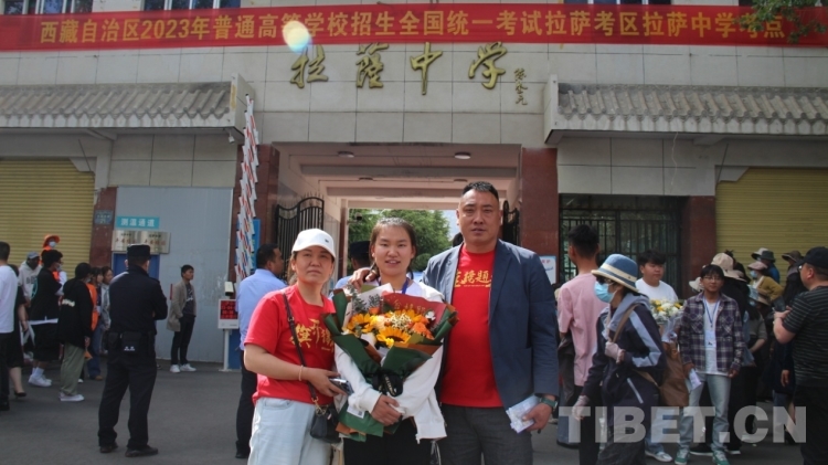 6月8日下午,在拉薩中學(xué)考場外,家長們穿著藏裝、旗袍、印有“金榜題名”“旗開得勝”等加油短袖,手捧鮮花和哈達迎接第一波結(jié)束高考的考生。“今天,閨女終于要結(jié)束高中生活了,希望她能如愿考上軍校。”劉先生夫婦穿著專門為女兒定制的加油短袖,備好鮮花到考場外迎接女兒。像他們一樣,考場外拿著鮮花與哈達、祝賀橫幅、勵志牌等的考生家屬和親戚漸漸多了起來。