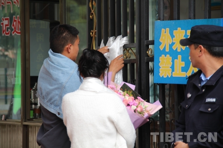 圖為考生考試結(jié)束后向母校的大門掛哈達表感激 攝影:德吉卓瑪
