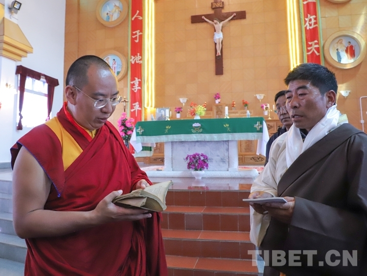 圖為班禪在鹽井天主教堂翻看藏文版《圣經》 攝影:賈華加