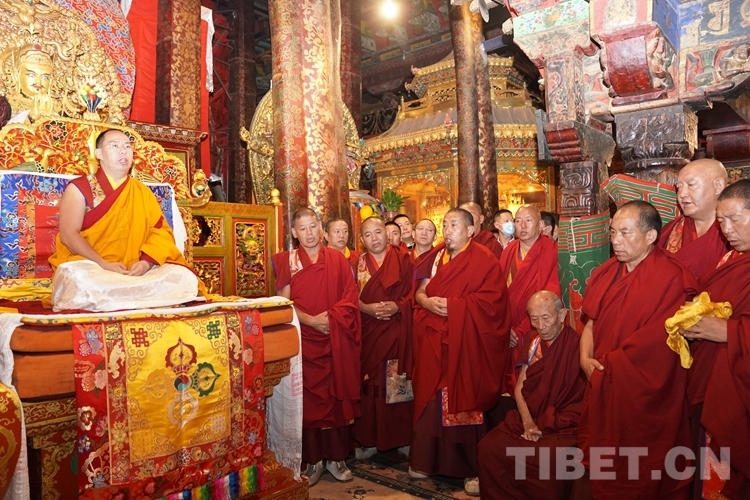 中國西藏網訊 6月25日凌晨,全國政協常委、中國佛教協會副會長、中國佛教協會西藏分會會長班禪額爾德尼·確吉杰布在拉薩大昭寺朝拜釋迦牟尼佛像,并為大昭寺僧眾摸頂賜福。