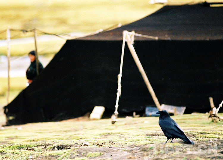 在雙湖辦事處北措折鄉(現雙湖縣措折強瑪鄉)一帳篷前,一只烏鴉在漫步(唐召明2001年攝)