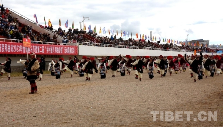 開幕式以方隊入場儀式拉開序幕,國旗方隊、會標方隊、民兵方隊、“鄉(xiāng)村振興 那曲奮進”冠軍代表方隊、文藝代表隊以及那曲11個縣區(qū)代表隊和馬術(shù)表演方隊依次入場。那曲各族干部群眾身著盛裝、載歌載舞,充分展示了藏北民族優(yōu)秀傳統(tǒng)文化以及新時代那曲各族人民幸福安康、奮發(fā)進取的新風(fēng)采。