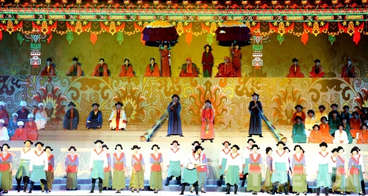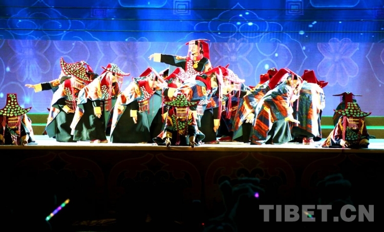 隨后盛大的開幕式文藝演出如期而至。演出共分為《悠遠(yuǎn)古韻》《詩意微芒》《如炬經(jīng)典》《輝煌盛世》四個(gè)篇章。《悠遠(yuǎn)古韻》篇章為大型情景表演,結(jié)合古格壁畫為開場(chǎng)表演,展現(xiàn)出阿里人民群眾的精神面貌和獨(dú)特的阿里神韻?!对娨馕⒚ⅰ穮R集阿里地區(qū)諸多極具代表性的國(guó)家級(jí)非物質(zhì)文化遺產(chǎn)節(jié)目,展現(xiàn)阿里地區(qū)悠久燦爛的古代文明遺存?!度缇娼?jīng)典》篇章通過不同舞蹈,展現(xiàn)阿里獨(dú)具特色的民間歌舞文化?!妒⑹老腋琛穭t展現(xiàn)了阿里地區(qū)以熱情昂揚(yáng)的姿態(tài)在全力以赴推動(dòng)建設(shè)雪域高原“西部明珠”中取得的一系列可喜的成績(jī)。