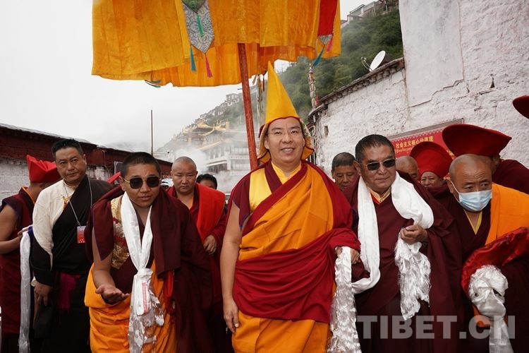 當日11時許,在眾僧的期盼中,班禪一行抵達直孔替寺。頓時,現場法號齊鳴、法螺合奏,直孔瓊倉·洛桑強巴活佛和僧眾在寺廟前舉行了隆重的歡迎儀式。