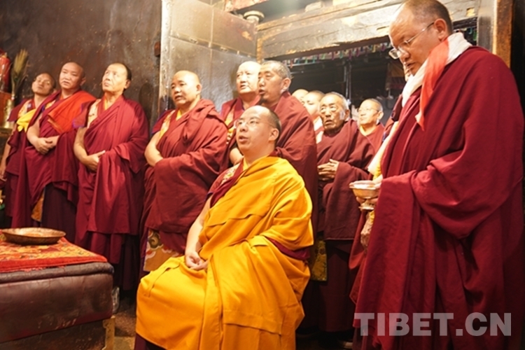 在措欽大殿,班禪虔誠叩拜供奉于此的佛祖釋迦牟尼佛像和藏傳佛教格魯派始祖宗喀巴佛像,與僧眾共同念誦經文,之后回到寢宮拉讓殿。