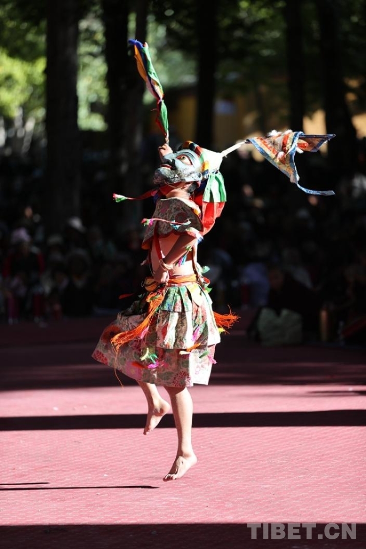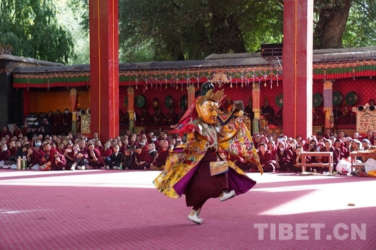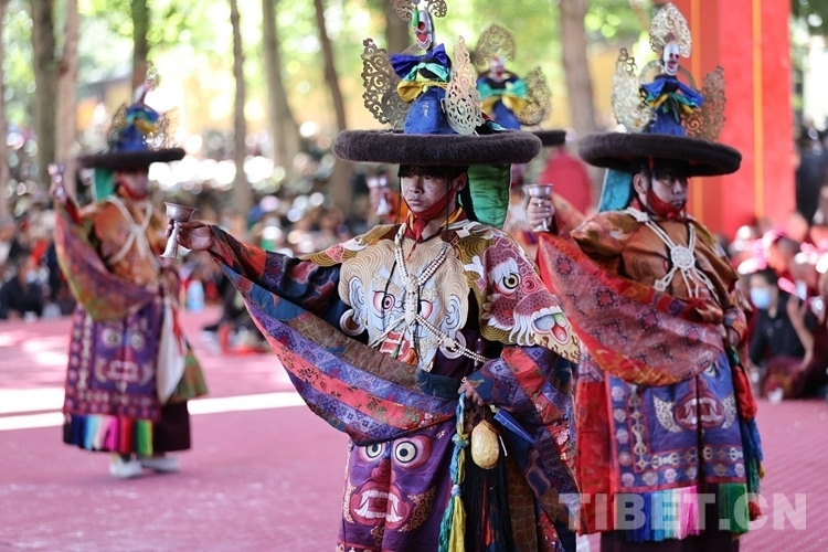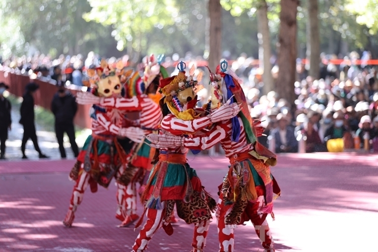當渾厚悠遠的法號、法螺聲在大院內外回旋開來,“羌姆”表演正式拉開帷幕。期間,僧人頭戴面具,身穿戲裝,手持鼓刀斧等道具,逐次表演金剛、骷髏、鹿牛、比丘、鴉鴟、六長壽等數十節神舞,氣氛莊重而神秘。