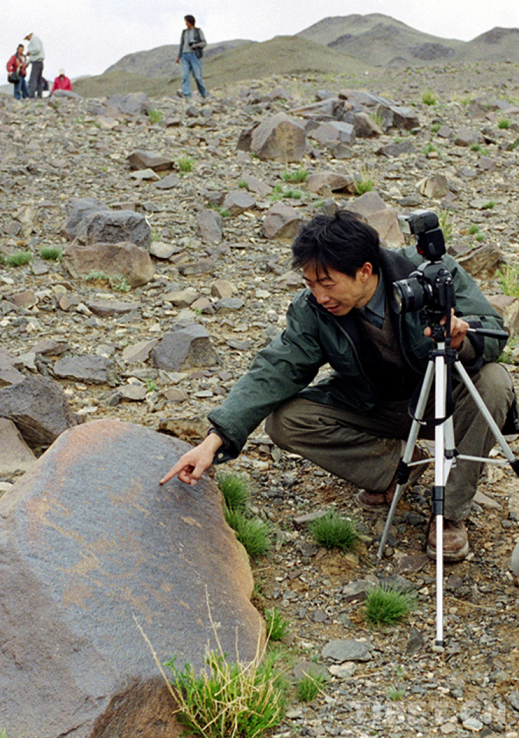 藏北高原無人區科考團人員在對尼瑪縣榮瑪鄉加林山巖畫進行科考(唐召明2001年攝)