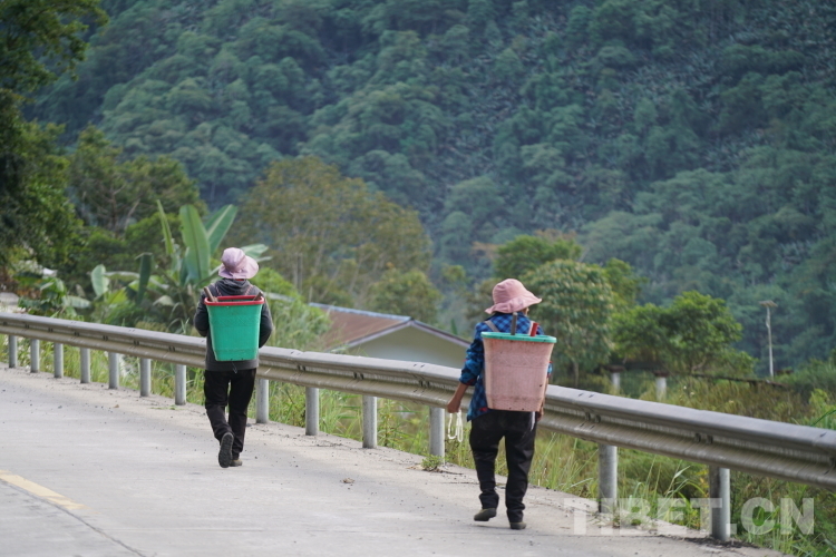 圖為行走在墨脫縣德興鄉鄉間公路上的村民,她們依然保留著背東西的習慣 攝影:趙振宇