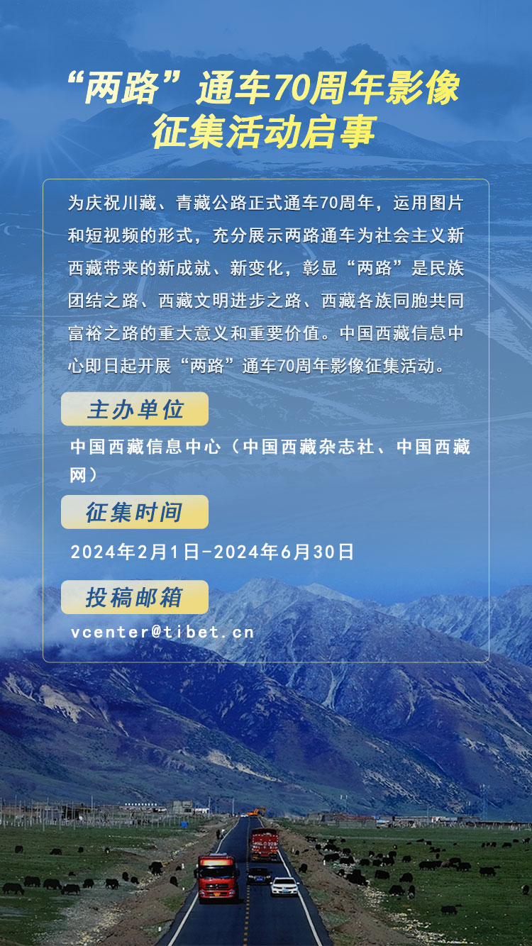 為慶祝川藏、青藏公路正式通車70周年,運(yùn)用圖片和短視頻的形式,充分展示兩路通車為社會主義新西藏帶來的新成就、新變化,彰顯“兩路”是民族團(tuán)結(jié)之路、西藏文明進(jìn)步之路、西藏各族同胞共同富裕之路的重大意義和重要價值。中國西藏信息中心即日起開展“兩路”通車70周年影像征集活動。