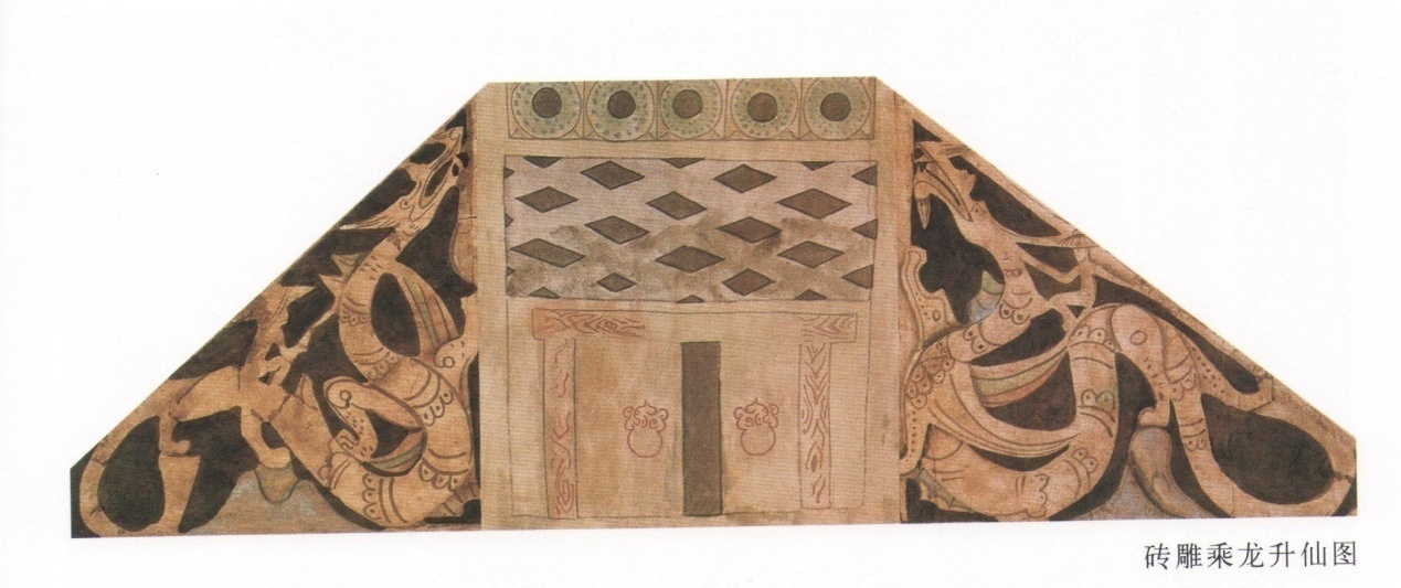 圖為洛陽燒溝61號西漢墓磚雕造型:神人乘龍升仙圖。門上的五個玉璧代表天國之門。