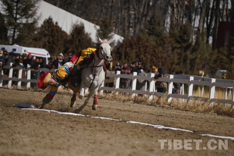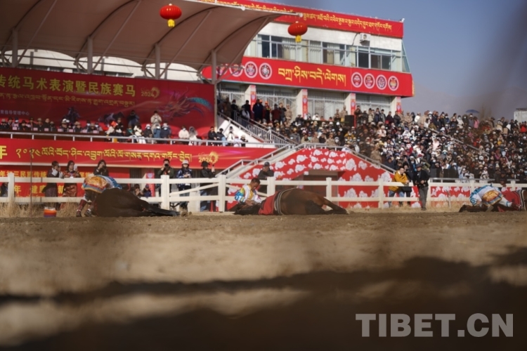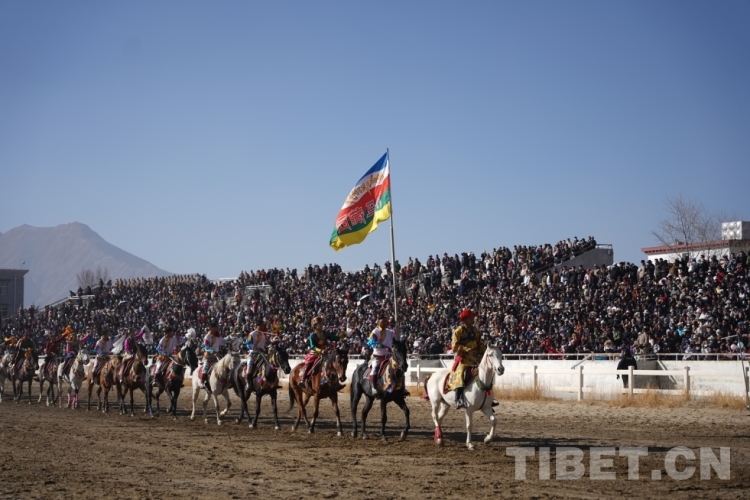 中國西藏網訊 2月12日上午,藏歷木龍新年初三民族傳統馬術表演暨民族賽馬活動在拉薩賽馬場舉行。此次活動包括民族賽馬和馬術表演。其中,民族賽馬包括3000米、5000米、8000米三個項目,馬術表演共有18個大項、20余個小項。馬術表演與民族賽馬穿插進行。現場約8000名觀眾共同欣賞了精彩的馬術表演,觀看了激烈的速度賽馬,共慶佳節。