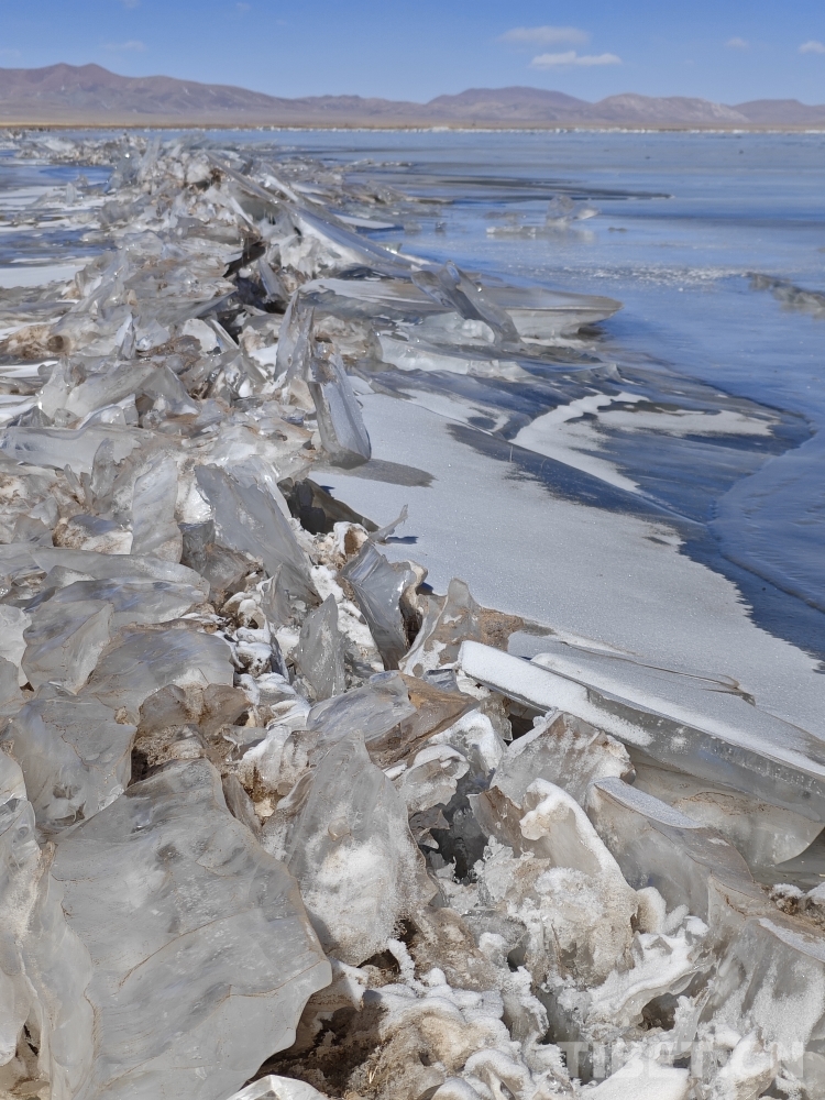 錯那湖湖面海拔4600米左右,面積400多平方公里,是世界上海拔最高的淡水湖,更有冰泡、冰裂、冰推等奇妙的自然景觀。當氣溫急劇下降時,水溫也驟降,湖底產生的氣體在上升過程中被凍在冰中,形成許多細小的白色氣泡,懸浮在厚厚的冰層之中。湖水表面一層被藏北的朔風快速凍結成冰,部分碎冰在岸邊堆積,形成隆起的“冰岸線”。又由于初春晝夜溫差較大,湖冰崩裂,形成網狀的冰裂紋路。這些透明裂紋從岸邊開始,像潮水一樣漫過平地,漫過羌塘草原腹地,漫到天邊,把羌塘大地裝扮成一個冰晶縱橫交錯的世界。(中國西藏網 文/李一凡 張萌萌 龍真多吉)