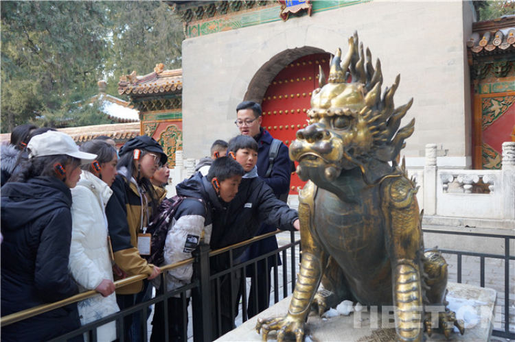 原來宮殿的排水系統既科學又美觀,原來屋脊神獸有避雷的作用,原來宮殿前的動物造型香爐是古代版“舞臺干冰制造器”……故宮的建造元素如此豐富,來自各個地區和民族。隨著講解員的介紹,同學們被古人的智慧深深折服,對這座皇家園林有了了解和自己的認識。站在宮殿的高處,學生們遙望到矗立的白塔,遙望到屋頂龍形裝飾的雨花閣,據說里面都是清朝皇帝收藏關于藏傳佛教的“寶物”,那里有關于西藏的歷史故事。