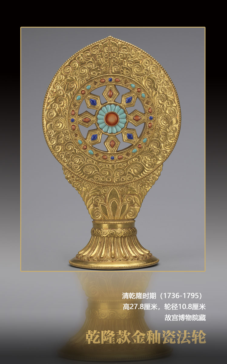 清代皇家崇奉藏傳佛教,乾隆登基后曾命內(nèi)務府造辦處下屬的景德鎮(zhèn)御窯廠燒制各式瓷質(zhì)佛像與法器備供奉之用。此款金釉瓷法輪仿自當時銅鎏金法輪,為乾隆朝所首創(chuàng),至嘉慶朝仍有制作,只是底款不同,型制并無區(qū)別。這種瓷質(zhì)法輪不僅以金彩仿出銅鍍金效果,還以色彩鮮艷的釉色仿出綠松石、青金石、珊瑚等各種寶石,不得不贊嘆當時工藝的創(chuàng)新與突破。