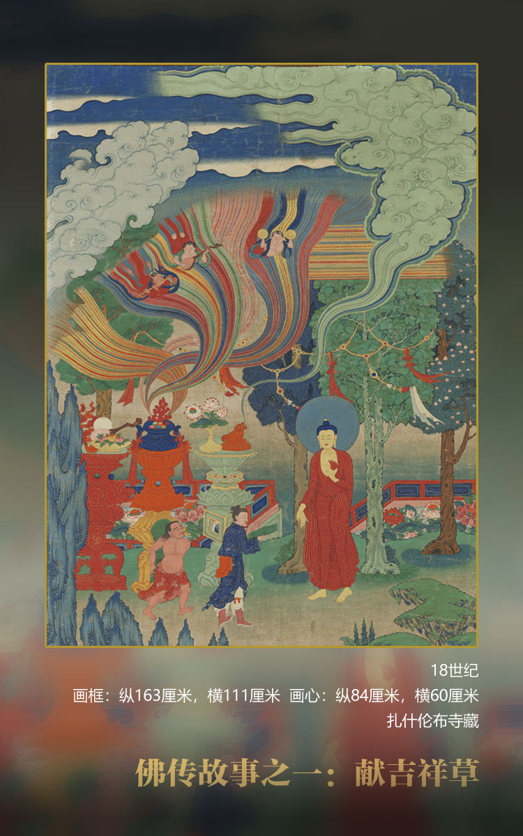 這幅唐卡是佛傳故事組畫中的一幅,雖然畫面充滿了夸張和裝飾意味,但是其場景很可能是表現佛從尼連禪河沐浴出來以后,要到菩提樹下入定,決意悟道的場景。佛著貼體透明袈裟,衣紋細密,右手施與愿印,左手持衣角,立于樹下,作欲行走狀,頗有古風。前面有二人,一為俗裝,可能是刈草人,著藍色衣,束發,手捧吉祥草,后隨夜叉,也背負大捆吉祥草迎面走來。佛右側供榻和供幾上,擺放五欲供,獅形香爐口中吐出香煙,裊裊升入空中,頗有漢風。供品之后也有五色光芒升入天空,光芒之中有三個童子伎樂天,作演奏狀。此畫有兩個引人注目的特征,其一,五色光芒以極細絲線畫出,密集排列,高處一端如絲線被剪斷一般整齊,這種畫法常見于四川德格(sDe dge)八蚌寺(dPal spung dgon)司徒班欽活佛(Si tu Pan chen chos kyi 'byung gnas, 1700-1774)風格的繪畫中。其二,欄板、天空、樹下、巖石、地上竹筍、陰影以藍灰色平涂,而石幾、樹干、中間的地面等以淡綠色表現,加之淡黃色空蒙的遠景令我們想到以司徒班欽為代表的八蚌寺藝術風格,以及深受云南麗江藝術風格影響的十世嘎瑪巴曲英多杰的繪畫作品。司徒班欽也跟云南有著密切關系,他的諸多風格獨特的菩薩繪畫,構圖以及色彩運用都毫無疑問地受到來自云南當地藝術的影響。司徒班欽是一位偉大的藝術家,設計了很多獨特的圖像,如八大菩薩、大成就者和佛傳故事。這幅佛傳故事是極為少見的一幅,充分展示了他無限的想象力,比噶瑪嘎智畫派在漢藏藝術結合的路上走得更為深遠。因此,此幅唐卡應當是來自于八蚌寺的繪畫,其年代當在18世紀左右。