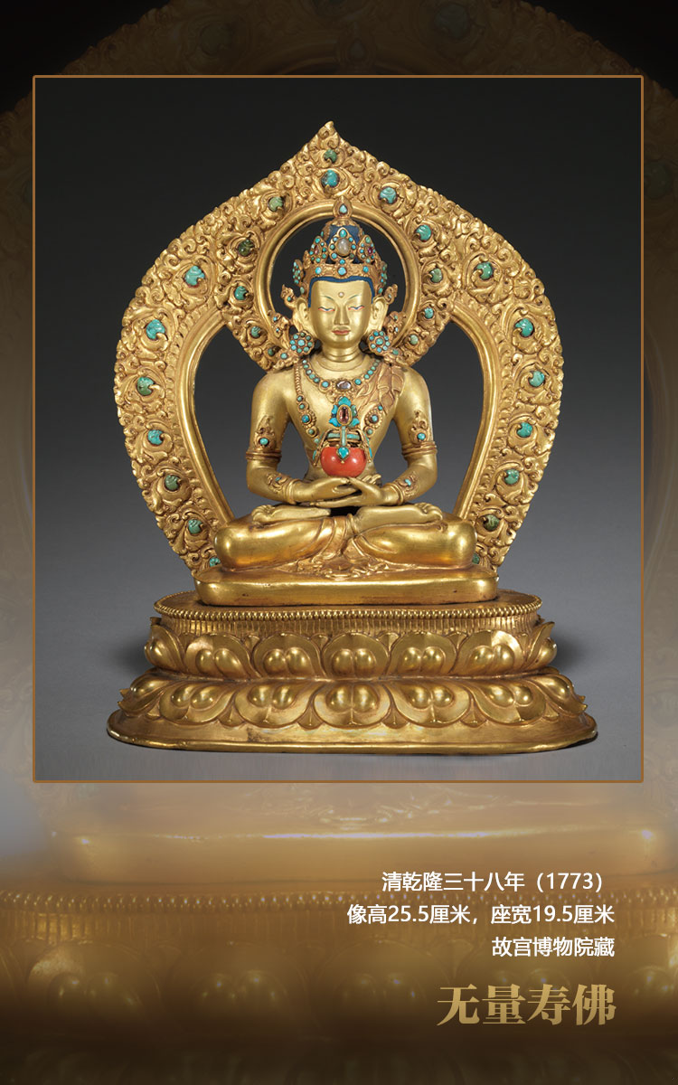 這尊造像與其他五十五尊同樣造型的無量壽佛,一同供奉在紫禁城養性殿西暖閣佛堂的一座八面七層的紫檀木佛塔中。根據《六世班禪洛桑巴丹益希傳》、內務府造辦處《活計檔》及軍機處滿文檔案的記載,乾隆帝在乾隆三十五年(1770)寧壽宮區域營建開始前,即乾隆三十三年(1768)向六世班禪訂做了這五十六尊無量壽佛,佛像圖樣、鑲嵌寶石等材料均為宮廷提供。這些造像于乾隆三十八年完成并送回宮廷,此后一直供奉于養性殿佛堂至今。乾隆四十五年(1780)六世班禪進京朝覲,還曾親自瞻仰過此塔此像。故這組無量壽佛,是乾隆時期宮廷審美與扎什倫布寺造像技術的高度融合,經過乾隆帝本人親自設計,又有明確的制作時間,是清代宮廷造像及扎什倫布寺造像研究的重要標型器物。