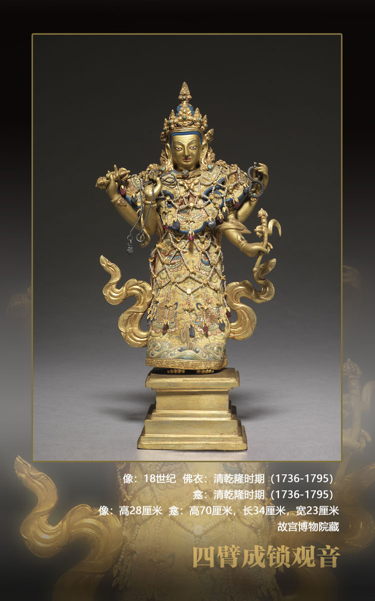 成鎖觀音,即不空羂索觀音。觀音一面四臂,分別持羂索、金剛杵、念珠、金剛鉤,在現在的圖像里很少找到持物相同的造像,可能是特別的傳承。觀音立姿站于方形臺座上。因其所著佛衣未曾打開,故造像身體裝飾情況不清。佛衣為清宮配做,繡工精細,上綴串珠瓔珞,極具宮廷風格。另有清宮配做紫檀木重檐亭式玻璃門佛龕,龕背面陰刻四體文題記,漢文為:“乾隆三十七年十二月十二日,欽命阿旺班珠爾胡土克圖認看供奉大利益扎什璃瑪四背成鎖觀世音菩薩。”“四背”即“四臂”的誤書。