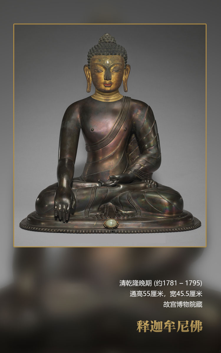 此尊釋迦牟尼佛寶相莊嚴,螺發肉髻,眉間白毫嵌碩大的東珠,雙眉上揚,眼睛垂視,微微含笑,面龐俊朗,表現了其青年形象。面部及頸部泥金,身體挺拔,肩膀寬闊;著袒右式袈裟,袈裟貼體,樣式簡潔。右手施觸地印,左手結禪定印,全跏趺坐于座墊上,底座缺失。