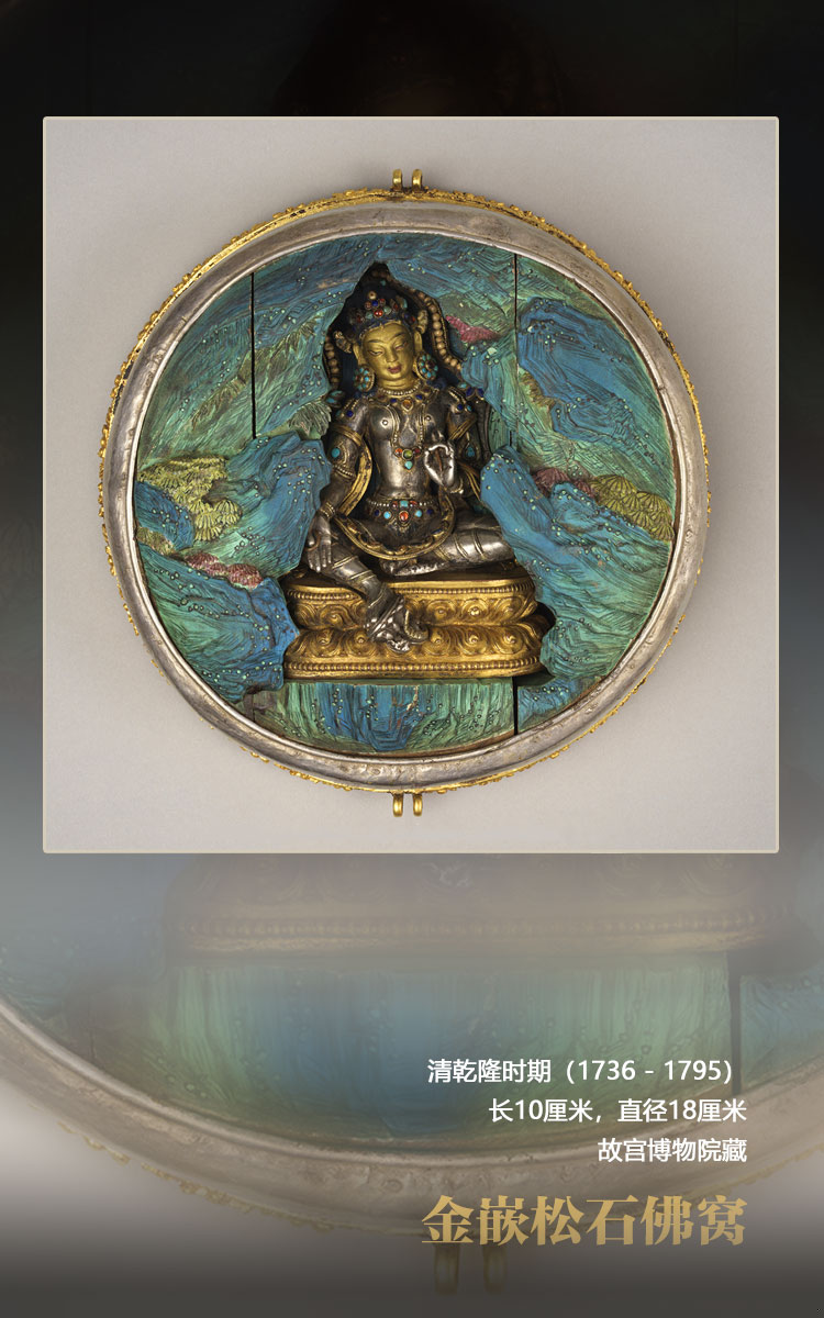 此佛窩九成金質,圓盒狀,金質盒蓋上滿嵌梯形同心圓狀綠松石片,側面有三條松石鑲嵌的裝飾帶及蓮花紋圖案。盒蓋兩邊有可拆卸雙耳,可穿繩佩戴頸上,為護身佛盒。盒內填染青綠木雕山洞,中間供有銀質綠度母一尊。度母面部泥金,右手與愿印,左手說法印,身上嵌綠松石、青金石、蜜蠟等,游戲坐于飾連珠紋和俯仰蓮瓣紋的金座上。附黃紙簽一張,上書漢、滿、蒙、藏四體文題記,漢文曰:“乾隆四十五年八月初七日,班禪額爾德尼恭?;噬掀哐f壽,遞丹書,呈進大利益綠衣救度佛母古佛。” 此處“大利益”有大功德之意,根據銘文可知,這個佛窩應是乾隆帝七十大壽時六世班禪敬獻的祝壽禮物。(文圖資料來源:澳門藝術博物館 中國西藏網 記者/易文文 趙佳 呂靜 王東 姚浩然)