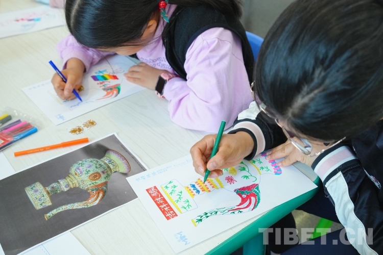 圖為參加“周日親子藝游”活動(dòng)的學(xué)生在畫具有藏族文化特色的奔巴壺(圖片由澳門藝術(shù)博物館提供)