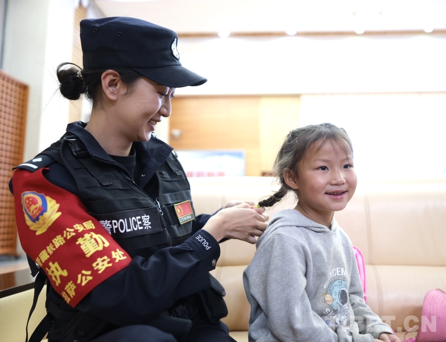 圖為5月31日,馬曉琴在執勤時,深受小朋友的喜愛,拉著格桑花辮起頭發,想要跟格桑花一樣靚麗 攝影:賀瑞明