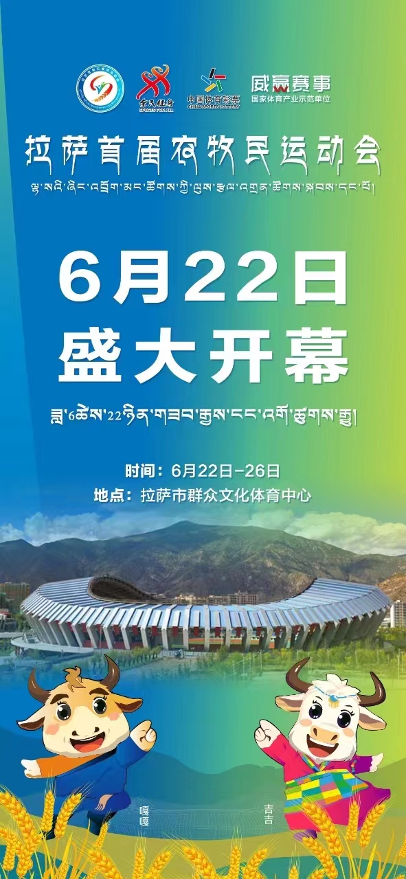 本屆農牧民運動會的會徽和吉祥物設計獨具特色。會徽由“L”(拉)、“S”(薩)、人形、牛角、青稞組合變形而成,象征著激情運動員和農牧民的日常生活,配色以紅、藍、綠和橙色為基色,體現了團結向上、積極進取的精神。吉祥物“嘎嘎”和“吉吉”,藏語意為“快樂”和“幸?!?,分別代表穩重的力量和熱情的活力。嘎嘎身著藍色的現代藏袍,吉吉穿著鮮艷的傳統藏裝,展示了藏族文化的包容開放和農牧民的健康向上風貌,營造熱烈歡快的運動會氛圍。
