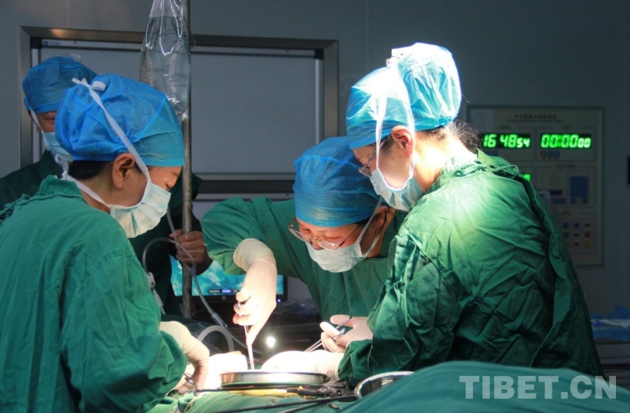 圖為航空總醫院婦科主任余立群(右二)在手術中指導甘孜縣人民醫院醫生操作手術 攝影:劉莉
