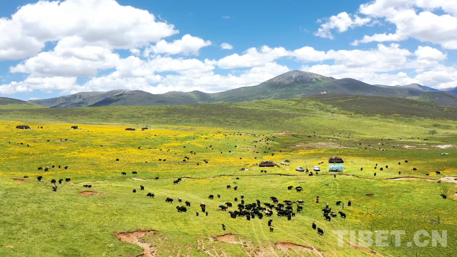 早晨天剛蒙蒙亮,他們就準備出發了,一家人把生活必需品黑帳篷,火爐,鍋碗瓢盆,被褥及酥油糌粑等物資打包裝車,由家人先駕駛拖拉機把所有物資運送到夏季遠牧點,四郎彭措則和他的侄兒騎馬趕牛出發。冬季牧場到夏季牧場距離60公里,他們經過9個小時的遷徙,終于在下午3點到達夏季牧場。此時他的家人也在鄰居的幫助下搭好了帳篷,煮好了酥油茶等待著他們。到了夏季牧場,牦牛們也迫不及待奔向了肥美的水草,四郎彭措和他的侄兒也終于可以卸下滿身的疲憊,品嘗家人們準備好的美食。夏季牧場正是一年當中最美的季節,草原上開滿了五顏六色的花朵,多日不見的好友也帶著自己的家人早一步駐扎在此地,四郎彭措說道:“夏季放牧,轉場雖然辛苦,但也是一年中難得的閑暇時光。夏季水草肥美,牦牛們有充足的食物,來到夏季牧場放牧的牧民也有更多的活動時間,賽馬、唱歌、跳鍋莊舞是我最喜歡的活動。”