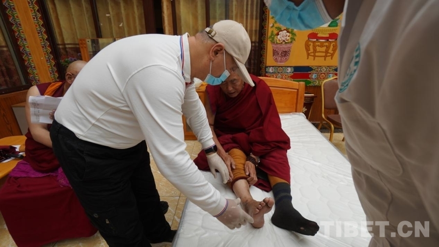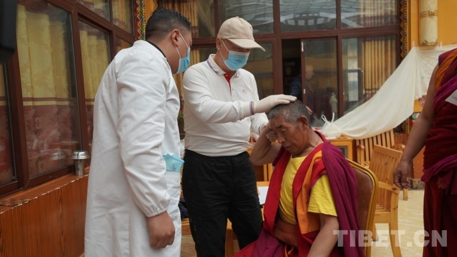 中國西藏網訊 7月10日,“同心·共鑄中國心”公益醫療團隊走進四川省甘孜藏族自治州理塘縣長青春科爾寺(又名理塘寺),為寺內僧人義診。現場義診的專家們平均年齡都在四十歲以上,他們都是一邊與高原反應抗衡一邊堅持義診,秉承著“缺氧不能缺精神”的態度堅持工作。