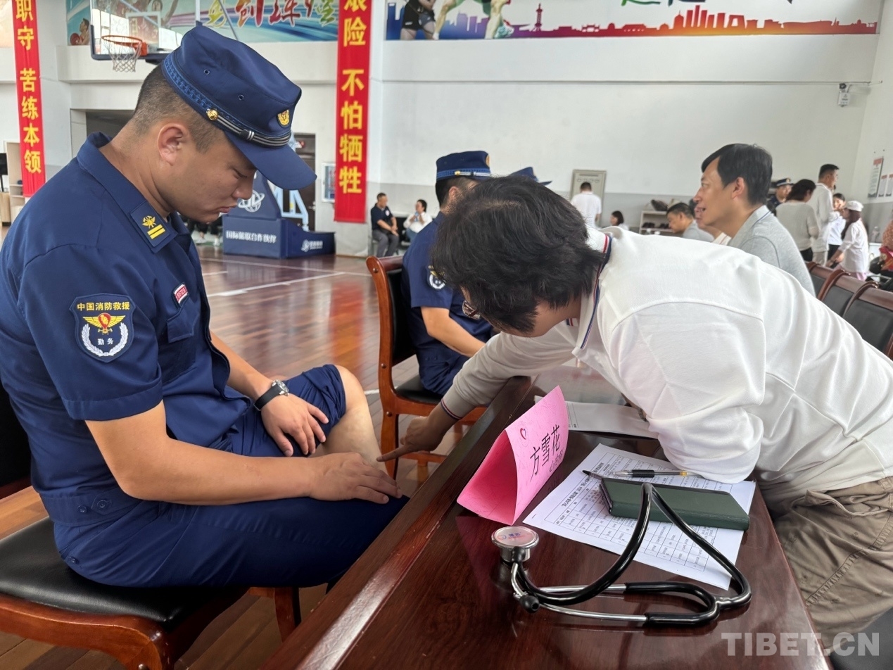 儀式結束后,志愿者們兵分兩路,一路為消防指戰員、武警官兵及退伍軍人開展義診,為他們送去溫暖與關懷;另一路參與到了消防科目演練中,進行了防水、防火、防震等應急救援相關技能培訓。