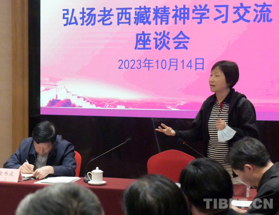 圖為北京建藏援藏工作者協會副會長張小康在協會召開的“弘揚老西藏精神學習交流座談會”上介紹“老西藏精神”(唐召明2023年10月14日攝)