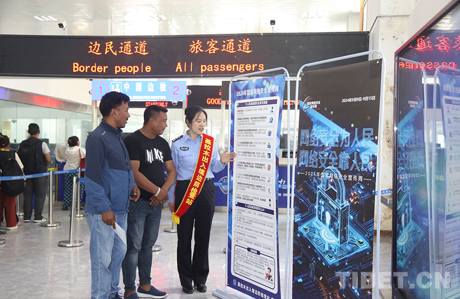 圖為聶拉木出入境邊防檢查站移民管理警察開展網絡安全周集中宣傳活動 攝影:高榮元